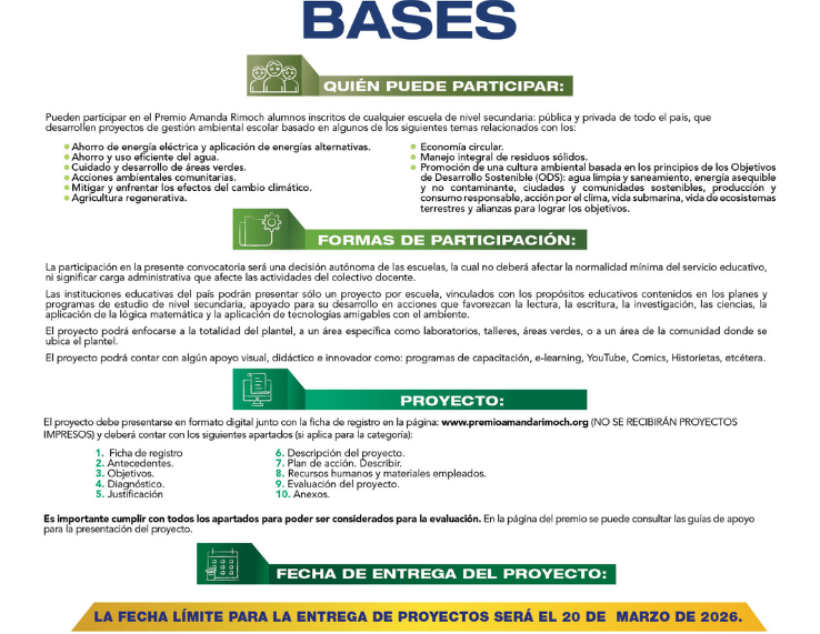 El Premio Amanda Rimoch a la Educación Ambiental es un galardón que busca impulsar la creatividad e innovación para que jóvenes de escuelas secundarias encuentren soluciones para problemáticas ambientales que afectan a su entorno y comunidad, así mismo promueve la educación ambiental y concientiza sobre la importancia de la sostenibilidad. Su misión es reconocer y apoyar esfuerzos excepcionales en la educación ambiental que fomenten un cambio positivo en la comunidad.